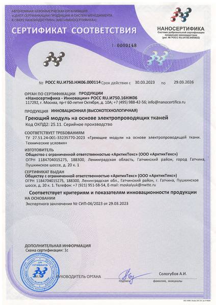 Сертификат соответствия № РОСС RU.И750.НЖ06.000114 по ТУ 27.51.24-001-33235770-2023 «Греющие модули на основе электропроводящей ткани».